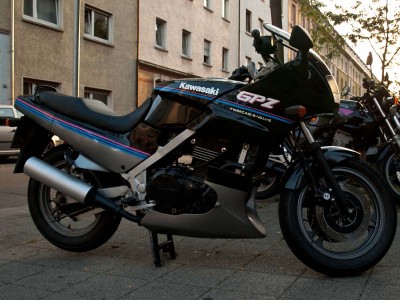 Wir wollen Euch jetzt mal unsere GPZ 500 Bj. 90 vorstellen. Sie war ein Spontankauf und stand ziemlich lang unbenutzt in einer Garage. Das Moped hat als ehemaliges Fahrschulmotorrad vermutlich schon sehr viele verschiedene Hinterteile gesehen und auch die Verkleidung hat hie und da mehr oder minder professionell geklebte Risse und Schrammen. Alles in allem ein netter used look, den eine Maschine mit über 75 tkm und als Einsteigermotorrad durchaus haben darf (wir sind beide seit der Fahrschule vor 7 Jahren kein motorisiertes Zweirad mehr gefahren).
