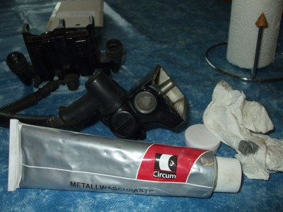 Dann die Kolben mit Spüli, Bürste, Hartholzschaber, Polierpaste, Chrompolitur, und einem Stück Leder auf einem Stück Holz in Schwung bringen. Das Lederholzding dient normalerweise zum feinen abziehen der Messer vom Räuber Hotzenplotz