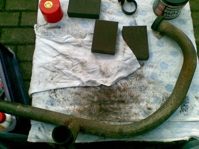 Eigentlich habe ich ja Mädchenarme, aber seit heute Nachmittag fühle ich mich wie Arnold Schwarzenegger. Der Grund: Ich habe meine Krümmer per Handarbeit entrostet und geschliffen. Das heiߟt, ich habe sie einfach abmontiert und stundenlang mit mehreren Schleifschwämmen unterschiedlicher Körnung den Rost und alte Lackreste abgeschrubbt.