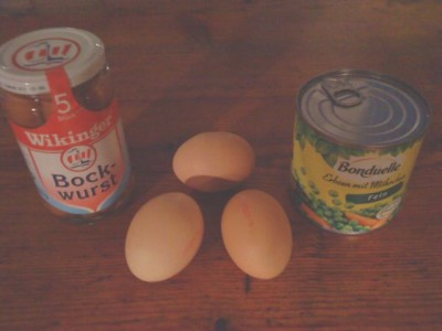Erbsen und Möhrchen in einen Topf, Würstchen klein schneiden und rein damit, die Eier auch noch drüber schlagen, mit Salz und Pfeffer würzen und ein paar Minuten köcheln lassen.