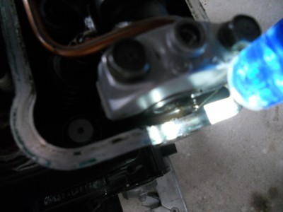 Ich meine nur, weil trotz äußerster Sorgfalt es passiert sein kann, dass mal ein kleiner Krümel Dichtmasse wieder aus der Pinzette gefallen ist und auf dem "Boden" dieses Zwischenraums gelandet ist. Dort steht auch etwas Öl drin, aber wenn ich senkrecht nach unten leuchte, sehe ich keine Bohrung. Kann ja aber sein, dass seitlich von der Nockenwellenseite aus eine Bohrung da ist, das konnte ich mit der Lampe nicht erkennen.
