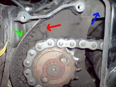 Jetzt erstmal meine eigentliche Frage: hat die im Bild rot markierte Schraube noch eine andere Funktion als das Bleche für den Kettenschutz (grüner Pfeil) zu halten? Also wird damit noch irgendwas wichtiges gehalten (Getriebedeckel) oder irgendwas was dichten muss? Weiߟ einer wie lang diese Schraube ist (ungefähr, also ob sie noch weiter rein reicht in den Motor)?