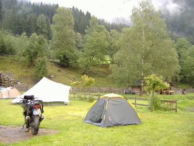 In Österreich angekommen bin ich einfach 3 Tage lang praktisch fast ziellos durch den Vorarlberg und den Tirol gefahren. Berg auf- Berg ab, Berg auf Berg ab. Ein Traum den sich Jeder gönnen sollte der Motorrad fährt. Der Straßenzustand war in Österreich überall mindestens zufriedenstellend bis sehr gut, so dass es nicht nötig war auf Dellen und Löchern ständig zu achten, und sich ausschlieߟlich dem Kurvenspaß und der Landschaft widmen konnte. Ausnahme waren einige wenige Straßen auf kleineren Pässen die teilweise nicht asphaltiert und eher das Terrain von voll ausgestatteten GS, und nicht von einer voll beladenen Gpz war. Nachts hab ich problemlos auf Campingplätzen übernachtet können. Kochen, und essen allein im Zelt war nicht unbedingt so unterhaltsam, danach ist man aber schnell in Kontakt getreten mit anderen Camper beim Feierabend-Bier in der Camping-Kneipe. Sofort schlafen gehen war aber auch kaum ein Problem. Man ist so geschafft wegen der Hitze, Kälte und 300 Km Kurven dass ich 2 Mal ohne zu essen und noch in voller Montur eingeschlafen bin.