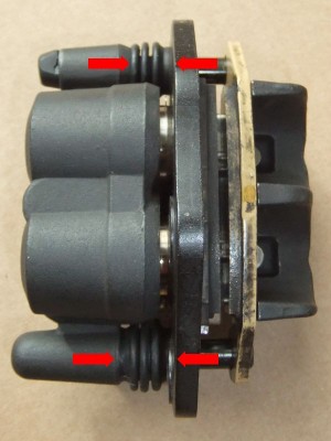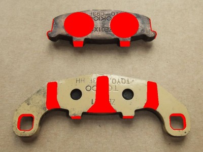 Die Führungen des Bremssattelhalter sollten laut Werkstatthandbuch mit PBC (Poly Butyl Cuprysil) Fett bzw. Hochtemperatur Silicon-Fett behandelt werden. Es gibt aber auch Meinungen das an dieser Stelle normales Lagerfett, Plastilube oder auch Keramikpaste zum Einsatz kommen kann. Wichtig ist auf jeden Fall, dass die Schmiermittel dünn aufgetragen werden, um die Beweglichkeit der Teile nicht durch unmengen an Schmiermittel zu behindern.[attachment=1]Die rot markierten Stellen an den Bremsbelägen, sollten mit Kupferpaste oder Keramikpaste behandelt werden. Dies beugt vorwiegent dem Bremsenquietschen vor. Es darf niemals Schmiermittel auf die Reibeflächen der Bremsbeläge gelangen![attachment=0]